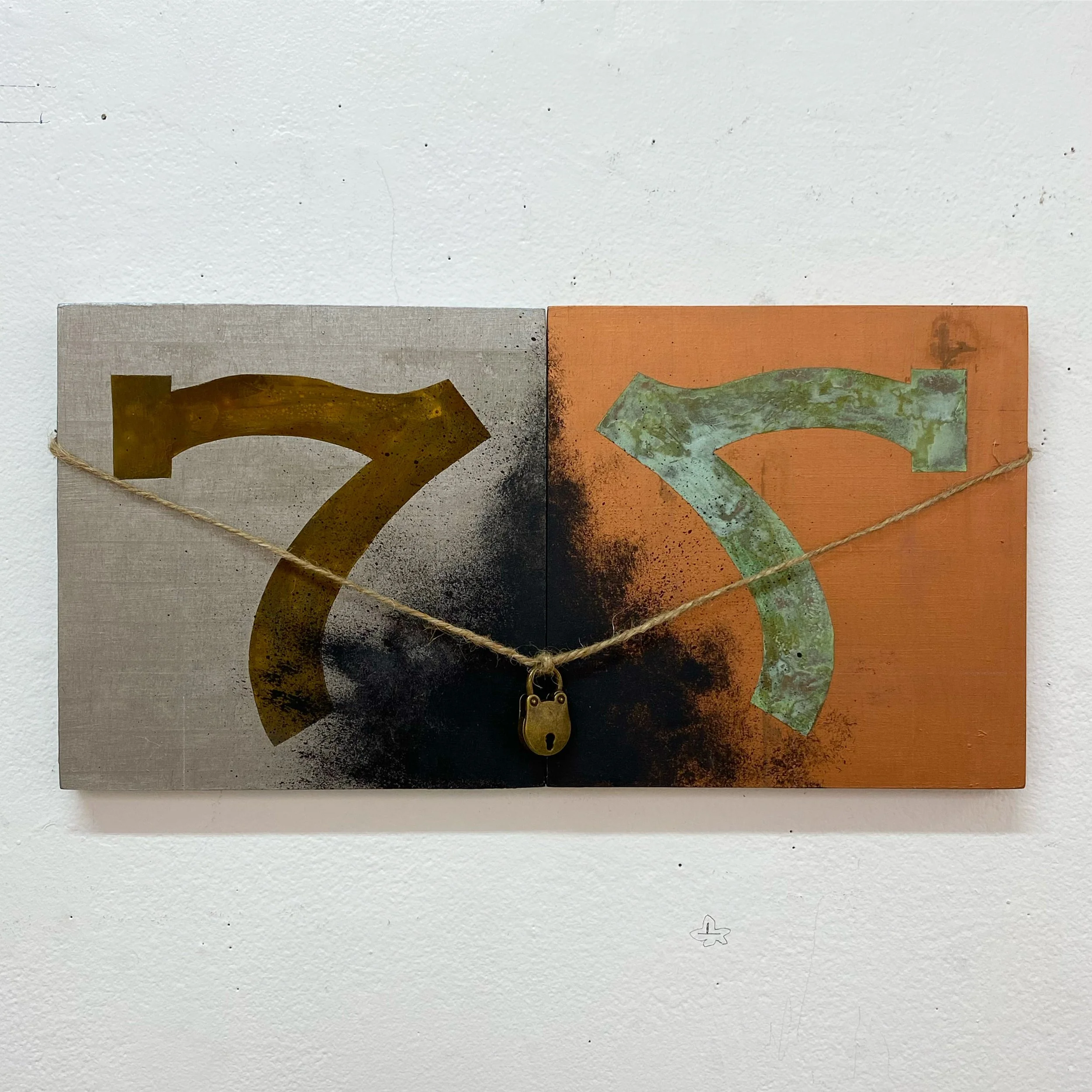 "Seven Up & Seagrams". Patina, spray paint, twine, lock. Two 8 x 8 inch panels. 2023.