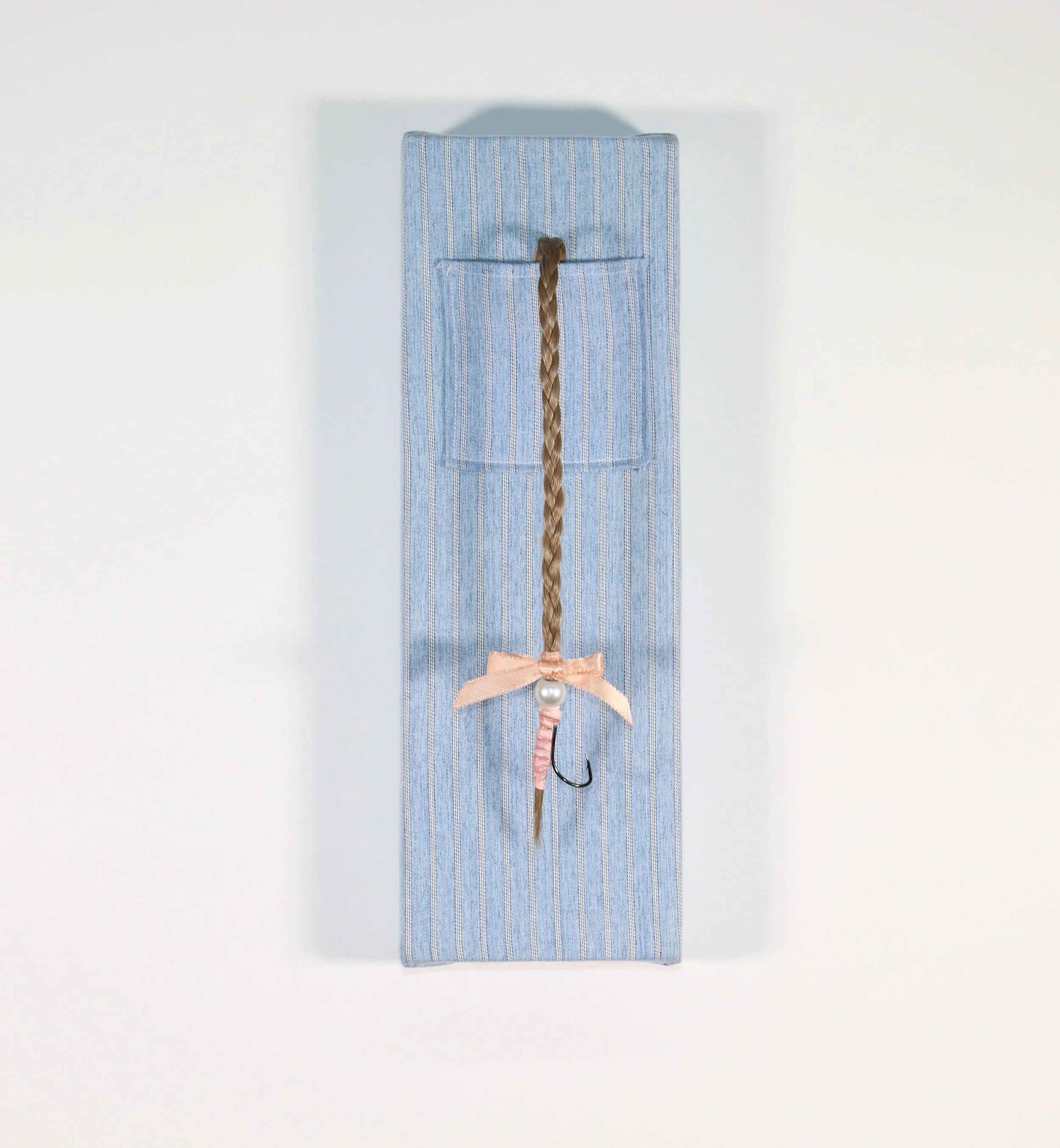 "Bait". Fabric, synthetic hair, satin ribbon, faux pearl, latex tape, acrylic paint, nail polish, fish hook. 4 x 12 in. 2025.