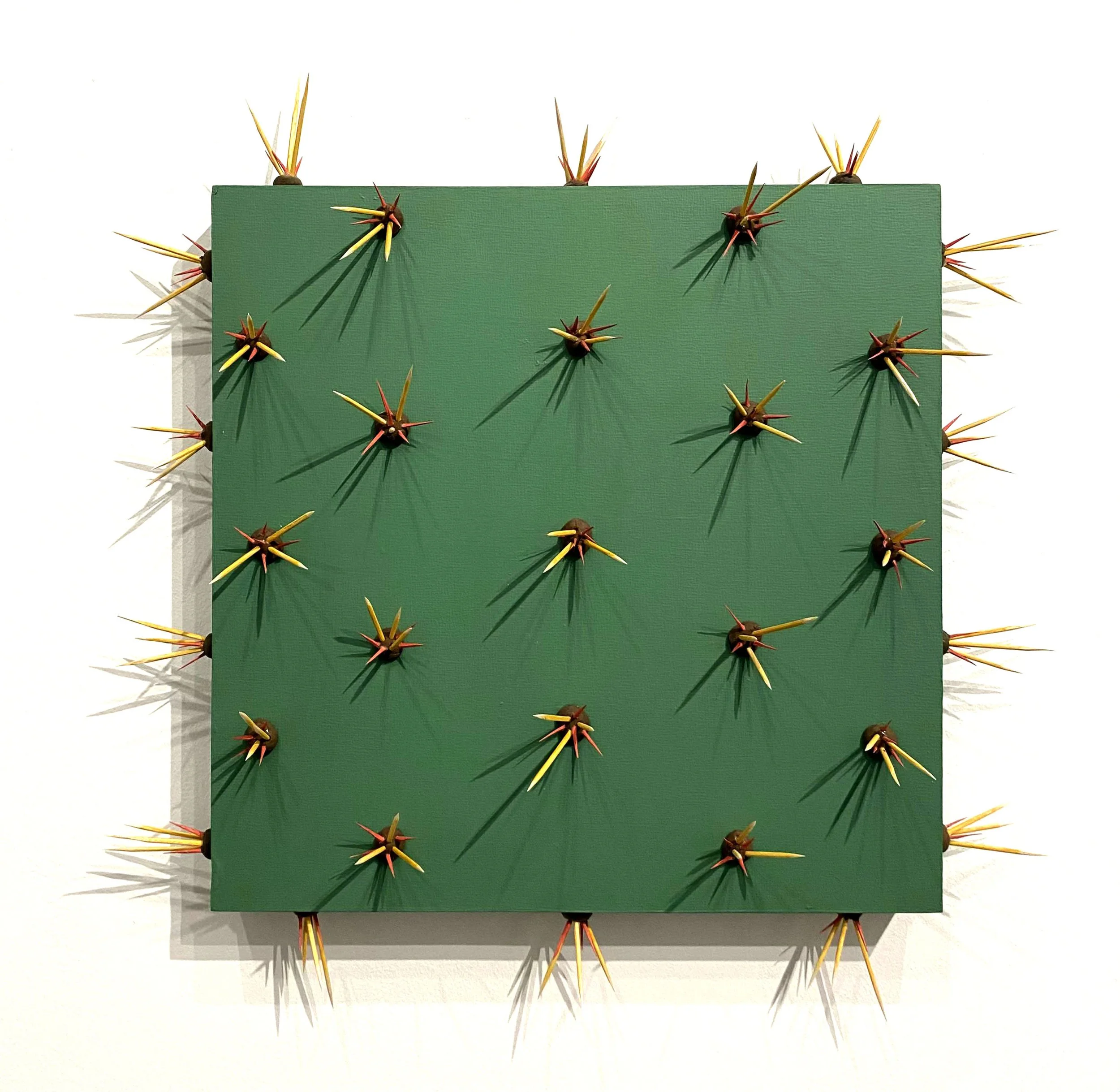 "Prickly Pear". Toothpicks, acrylic paint, air-dry clay, on panel. 16 x 16 inches. 2023.
