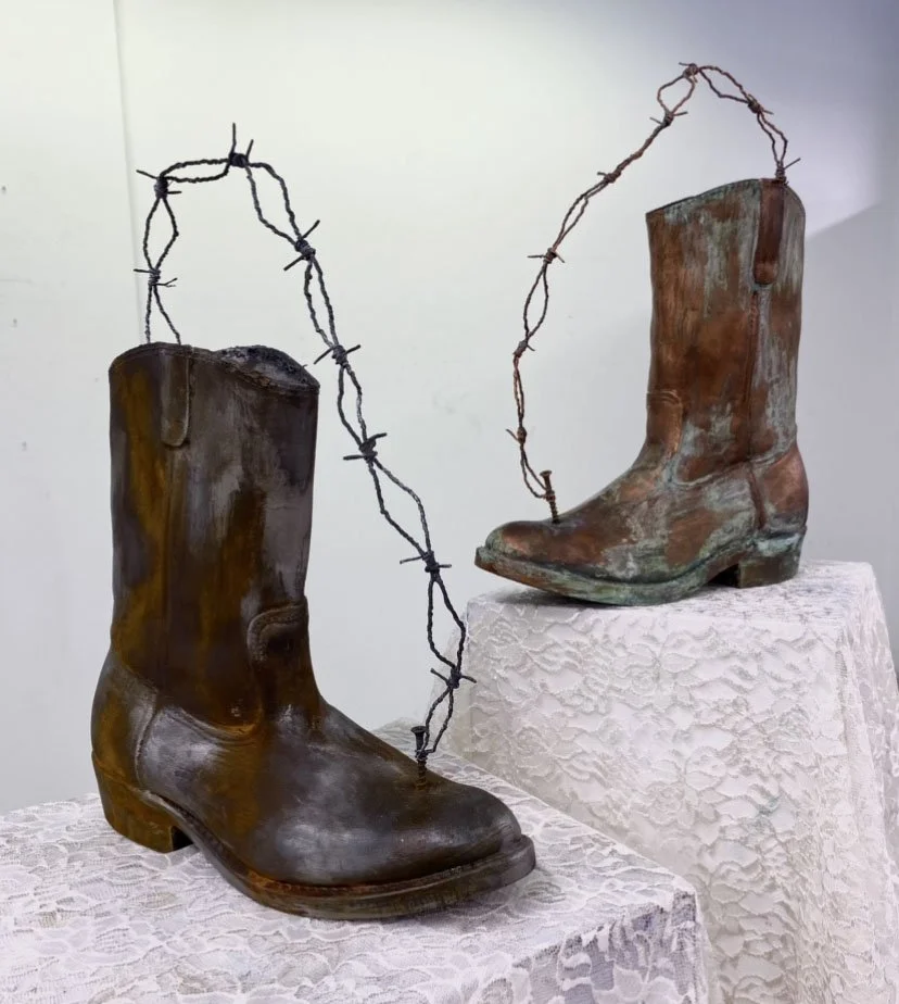 "Flying Shoes (Trying to Tie)". Boots, patina, wire, rocks. 2023.